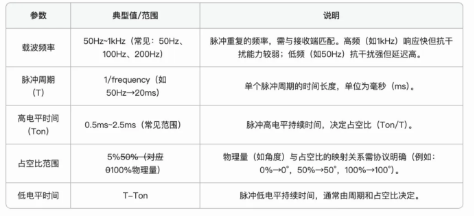 不同应用场景的PWM协议可能存在差异,但核心参数通常包括以下内容:
